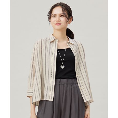 繊細なはしごレースが上品なクロップド丈シャツ■デザイン前立ての端に繊細なはしごレースを挟み込んだクロップド丈のシャツです。トレンドのクロップド丈でありながらも短すぎない着丈と、レースディティールの上品なバランスが着て頂きやすいアイテムです。プルオーバーのようにも、羽織りとして着ても今年らしいコーディネートになる1着です。※モデル画像はサンプルを使用しております。実際にお届けする商品は物画像(モデル画像ではない画像)をご参照ください。■素材日本の先染め織物産地で有名な西脇地方で作られた平織り生地です。再生繊維(セルロース)とリネンの特殊な混紡糸を使用しております。再生繊維(セルロース)のさらりとしたドレープ性の中にリネン独特の表情と光沢感がブレンドされ、両繊維の長所を掛け合わせた素材に仕上がっています。接触冷感、吸水速乾の機能付きです。■同素材アイテムフレア袖シャツ(BLW7GM0502)