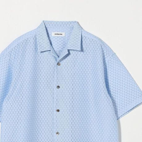 肌離れと清涼感のあるアイレット組織のラッセル素材を使用したオープンカラーシャツ。