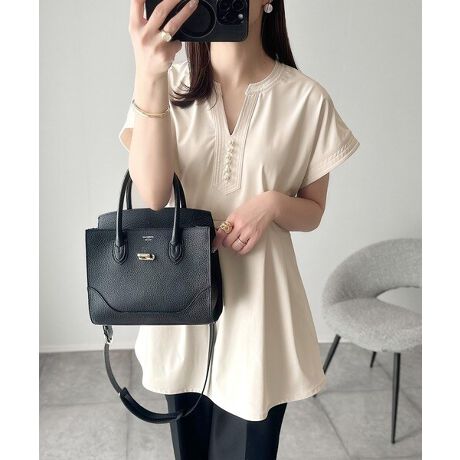 【接触冷感】上品さを纏う。胸元パールボタン使いペプラム半袖カットソーブラウス(遮熱・UVカット)