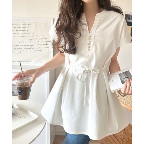 【接触冷感】上品さを纏う。胸元パールボタン使いペプラム半袖カットソーブラウス(遮熱・UVカット)