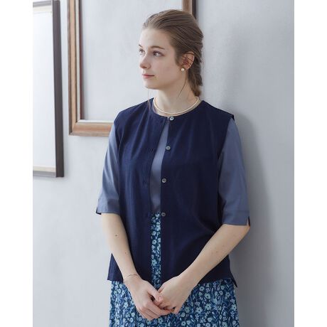 旬のシャイニー感と透けすぎないシアー感が魅力の上品見えラメクルーネックベスト。