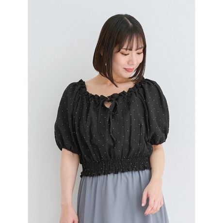 ビジューを散りばめたキラキラデザインがフェミニンムードたっぷりオフショルブラウス