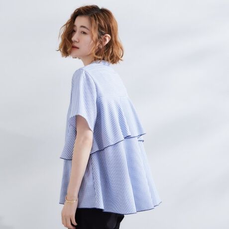 後ろ身頃にたっぷりフレアーを入れたバックシャンフリルシャツです。