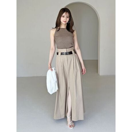 厚手のコットンチノ素材にタックを入れてボリュームを出し、前後に深めのスリットを加えて程よい抜け感を加えた今季トレンドライクなベルト付きワイドスカートが到着しました。ワイドパンツのようにボリューム感を出したロング丈でのお作りで、縦長ラインが強調され、美脚効果も抜群な1枚です。ハイウエスト仕様で、ウエスト位置にはベルトループをプラス。単品使いにも便利な高級感のある太めの合皮ベルトがセットで便利です。サイドとお尻側にポケットが2つずつついています。
