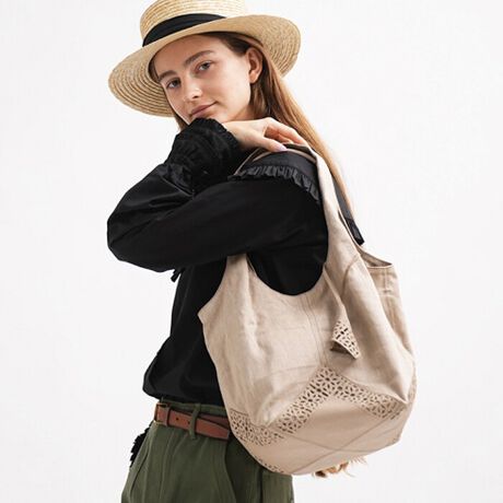 カットワークをあしらい、正方形4枚縫い合わせた様子がトルコタイルのような革底は、涼しげで軽やか。袋物のカジュアルデザインながら、繊細なカットワークと上質な素材で、上品で洗練された仕上がりに。