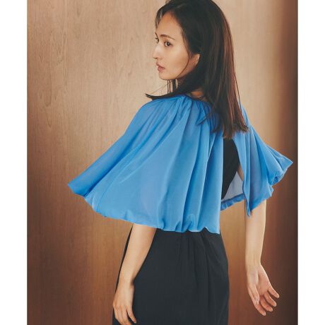 衿周りに細かいギャザーをたっぷり入れ、身体から離れ揺れる空気感を纏ったケープボレロです。きちんとしたシーンにもおすすめで、オンオフ問わず着られ、気負わず日常にフィットしてくれる大人フェミニンスタイルが叶います。
