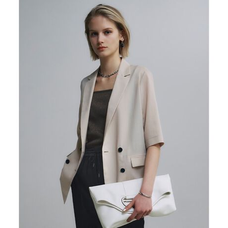 ■デザイン上品なシアー感ある涼し気な半袖ダブルジャケット。シンプルになりがちな夏のスタイルにも、羽織るだけで今年らしいきちんと感が演出できるキレイ目ジャケットで、ON/OFFシーン幅広く活躍します。ラミー混素材の艶やかな美しい光沢が女性らしい印象。真夏の冷房対策にも重宝する一着です。
