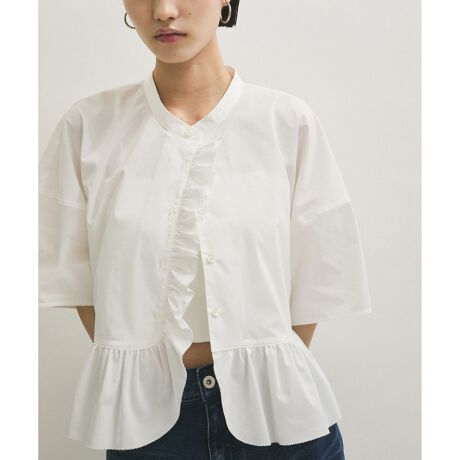 ゆったりとしたコクーンスリーブとフロントのフリルが魅力的なブラウス。