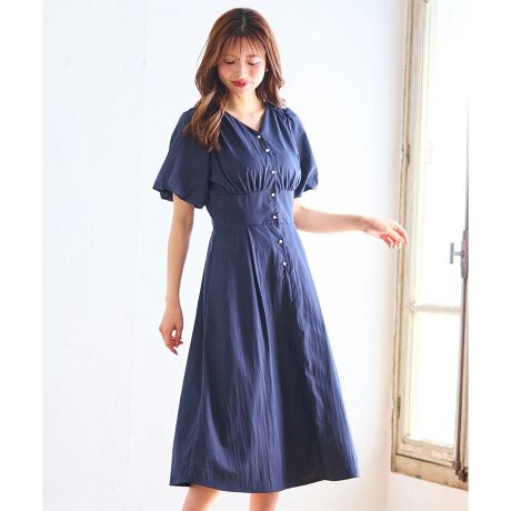 フェミニンなバルーンスリーブが魅力の上品ワンピース。シンプルな無地のデザインながら、ふんわりとした袖のシルエットが華やかさをプラスします。フロントは前開き仕様でパールデザインのボタンが上品なアクセントに。柔らかな曲線を描くVネックはデコルテを美しく見せつつ、お顔周りを明るく演出します。程よい艶感のある生地を使用し、動くたびに上品なニュアンスが漂う一着。デイリーはもちろん、オケージョンや特別な日のスタイリングにもぴったりなワンピースです。