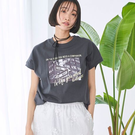 一枚でスタイリングが決まる、印象的なフォトプリントが目を引くフレンチスリーブTシャツ。