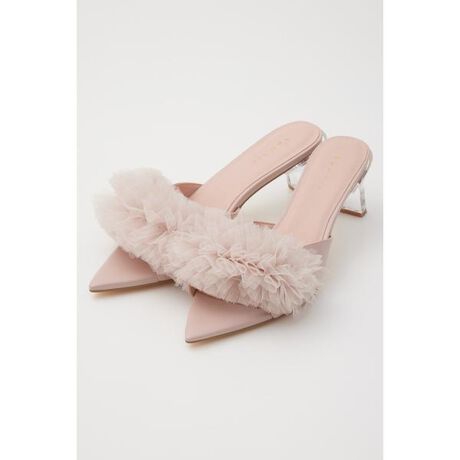 【華やかなチュールがフェミニンさを後押ししてくれるサンダル】■ポイントボリューム感のあるアッパーのチュールが大人フェミニンな印象のサンダル。アッパーは透け感のあるチュール生地をふんだんに使い、フェミニンで上品な仕上がりです。春夏のスタイリングに抜け感をプラスしながらも、華やかな印象に。ヒールはクリアヒールを採用し、つま先のラインはポインテッドトゥでシャープに仕上げてモードな雰囲気もプラスしました。高すぎないヒールで安定感があり、脱ぎ履きがさっとできるミュールタイプなのも嬉しいポイントです。■ディテール華やかでフェミニンな印象の中に、つま先やヒールでモードさをプラス。他にはない足元を華やかに演出してくれるサンダルです。■スタイリングシンプルなスタイリングに合わせるだけでもOK!コーディネートのポイントになるアイテムです。■商品のお気に入り登録お気に入りアイテムの再入荷・在庫1点などの通知を受け取ることができます。[注意事項]※画像の商品はサンプルです。実際の商品と仕様、加工が若干異なる場合があります。※画像の商品は光の照射や角度、お使いのモニター環境により、実物と色味が異なる場合がございます。※着用、お取り扱いの際は、アテンションタグをご確認ください。