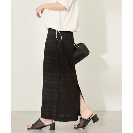 ・表面感のあるシャーリング加工が魅力的なタイトスカート。