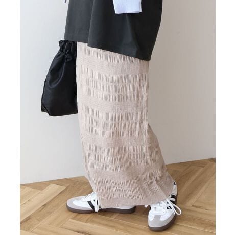 ・表面感のあるシャーリング加工が魅力的なタイトスカート。
