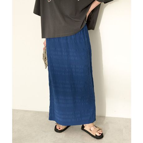・表面感のあるシャーリング加工が魅力的なタイトスカート。