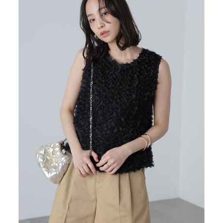 昨年ご好評をいただいたノースリブラウスが今年も登場!華やかな印象のノースリーブブラウスです。シャギー素材にカットワークを施しオーガンジーフリルをミックスした立体感のある素材を使用。クルーネックでフロントはスッキリとさせ、後ろネックは金属ジップで、甘さの中にカジュアルな印象をプラスしました。裏地付きなのも嬉しいポイント。デニムパンツやナロースカート合わせがおすすめです。※モデルの着用画像の場合、光の当たり具合により、実際の色味と異なって見えることがございます。色味は、商品単体の画像をご参照ください。