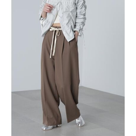 さらりとしたタッチの軽やかなT/R素材を使用したワイドパンツ。センタープレスできちんと感を出しつつ、ツータックで腰まわりを締めつけずに着ていただけます。ベルトにはカジュアルな杉綾リボンをプラス。ベルトは取り外しができるので、ONスタイルの時にはきれいめスラックスとしても着用可能。プリントTシャツ、トレンドのボーダーTシャツ、ポロシャツとのスタイリングがおすすめ。足元はスニーカーでカジュアル感をプラスするのもイチオシです。※モデルの着用画像の場合、光の当たり具合により、実際の色味と異なって見えることがございます。色味は、商品単体の画像をご参照ください。