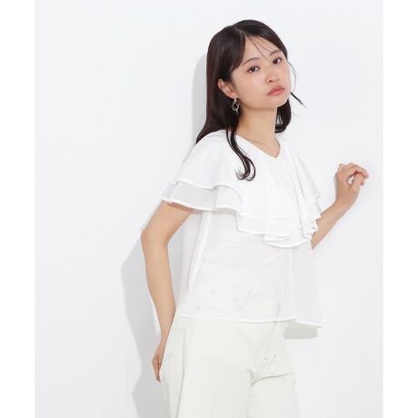 繊細なメッシュのような素材を使用したラッフルフリルブラウスです。シアー感が涼しげなデザインで、ラッフルディテールが二の腕を隠しながらこなれ感を演出。絶妙な丈感でインでもアウトでも着ていただけます。<素材>細かく繊細なメッシュレース素材を使用しています。<詳細>仕様・後ろボタン裏地・なし透け感・あり / 光沢・なし / 伸縮性・なし生地の厚さ・普通※モデルの着用画像の場合、光の当たり具合により、実際の色味と異なって見えることがございます。色味は、商品単体の画像をご参照ください。