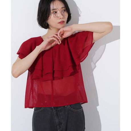 繊細なメッシュのような素材を使用したラッフルフリルブラウスです。シアー感が涼しげなデザインで、ラッフルディテールが二の腕を隠しながらこなれ感を演出。絶妙な丈感でインでもアウトでも着ていただけます。<素材>細かく繊細なメッシュレース素材を使用しています。<詳細>仕様・後ろボタン裏地・なし透け感・あり / 光沢・なし / 伸縮性・なし生地の厚さ・普通※モデルの着用画像の場合、光の当たり具合により、実際の色味と異なって見えることがございます。色味は、商品単体の画像をご参照ください。