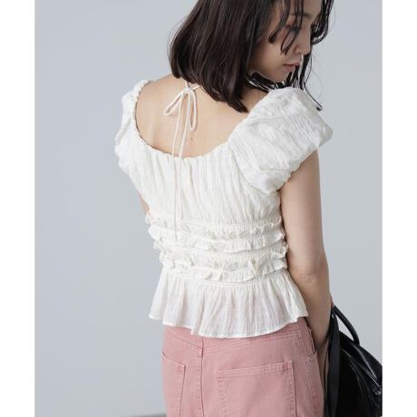 シボ感のある素材にギャザーのふんわりとした柔らかい印象で、旬なスタイリングが作れるブラウス。すっきりと開けたネックラインが、デコルテ周りをキレイに見せてくれます。フリルとシャーリングを施したウエストラインでメリハリを作り、バランスの取りやすいシルエットに。シャーリングによる伸縮性もあり着用しやすいのも嬉しいポイント。ホルターリボンは取り外し可能で、オフショルダー風に着るときにも安定感があります。ワイドデニムパンツ・スラックスなどのボトムス合わせがおすすめです。※モデルの着用画像の場合、光の当たり具合により、実際の色味と異なって見えることがございます。色味は、商品単体の画像をご参照ください。