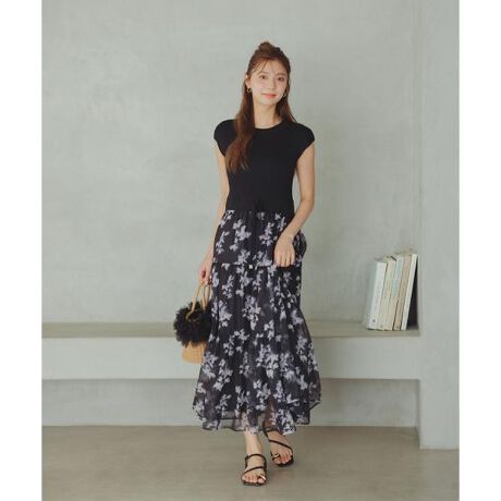 ニットと花柄スカートをドッキングしたワンピースです。涼しげなカラーのフラワー柄なので、これからの季節にぴったりな1枚。ウエストはゴム仕様で着心地の良さも嬉しいポイント。ジャケットやカジュアルなデニムジャケット合わせもおすすめです。