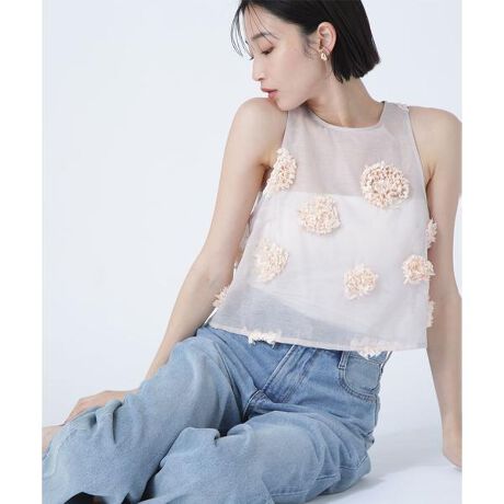 <BLANC(ブラン)>今のほしいをここに。自分らしく、自由なスタイリングを楽しみたい。洗練されたCLASS感と“今”を感じるモードフェミニンなアイテムを提案します。フラワーモチーフ付きの華やかな素材を使用したブラウスです。肩を華奢に見せるアメリカンスリーブデザインに、身頃はコンパクトでミニマルなシルエット。デニム合わせやハイウエストパンツとのコーディネートがおすすめです。<素材>シアーオーガンジーにフリンジのような立体的な花モチーフが付いた素材を使用しています。<詳細>仕様・後ろボタン裏地・なし透け感・あり / 光沢・なし / 伸縮性・なし生地の厚さ・薄手※モデルの着用画像の場合、光の当たり具合により、実際の色味と異なって見えることがございます。色味は、商品単体の画像をご参照ください。