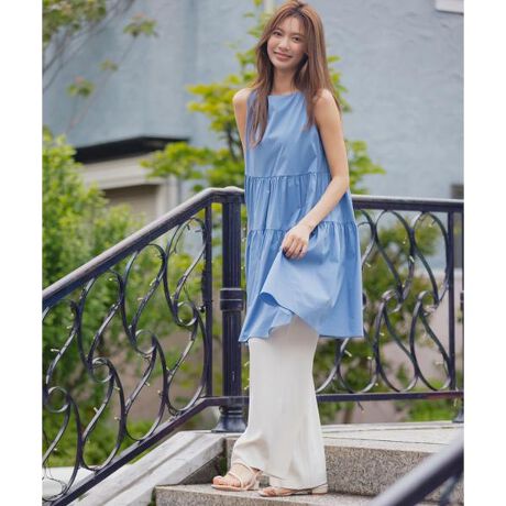 ティアードシルエットでフレアの分量を取ったミニワンピースです。暑い日は1枚でさらっと着られるノースリーブデザイン。後ろネックのリボン結びが愛らしいポイントに。ミニワンピとしても着られますが、デニムパンツとレイヤードもおすすめです。晩夏を感じるカラー展開なので長く着ていただけます。
