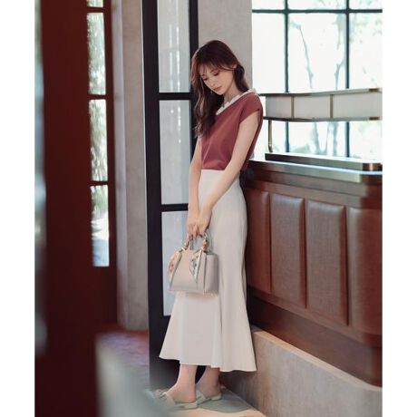スタイル良く見えるマーメイドスカート。ハイウエスト設定でお腹まわりをシンプルにまとめ、裾まわりで広がるマーメイドラインです。清涼感のある素材なので暑い夏にも着ていただけます。