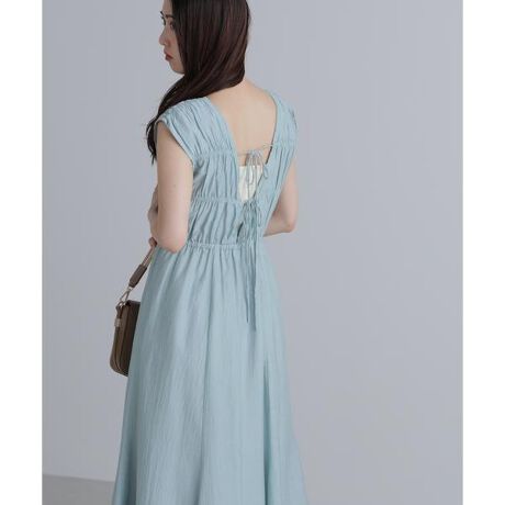 〔fabric&design〕サラッとしたタッチの生地を使用したマキシワンピースです。トップス部分は、前後にデザインしたシャーリングで柔らかい表情に。肩先まで隠れるフレンチスリーブが気になる肩回りをカバーしてくれます。深めに開けた抜け感あるバックデザインとリボンで、後ろ姿も抜かりなく魅せてくれます。ウエストはゴム仕立てでボディにややフィットし、裾にかけてたっぷりとしたギャザーが作り出すフレアシルエットがレディライクな印象です。〔styling〕1枚でコーディネートを完成させるのはもちろん、ジャケットやカーデなどを羽織っていただくのもおススメです。デイリーユースに加え、リラックスワンピとしても◎。