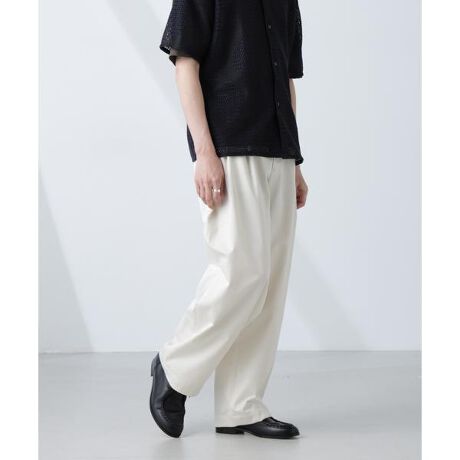 コットンながらもスラックスのような表情を持つ生地を使用し、高級感のあるワイドパンツ。程よくひざ下のシルエットをすっきりとさせることで、品のあるゆとりを追した一本。