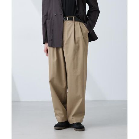 コットンながらもスラックスのような表情を持つ生地を使用し、高級感のあるワイドパンツ。程よくひざ下のシルエットをすっきりとさせることで、品のあるゆとりを追した一本。