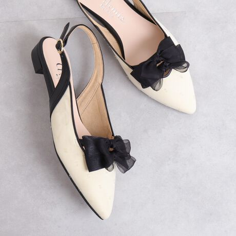 ・フェミニン要素満載ながらも、履き口&リボンの黒締めとポインテッドトゥで大人っぽく履いて頂けます。