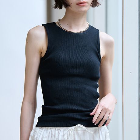 リブ編みの一種で生地の表面に凹凸感のあるテレコ素材は肌離れが良く、優れた伸縮性による心地良いフィット感が魅力。縫製されたブラカップ付きで、アンダーゴムを胴周り一周に入れているので着用時の安定感があります。