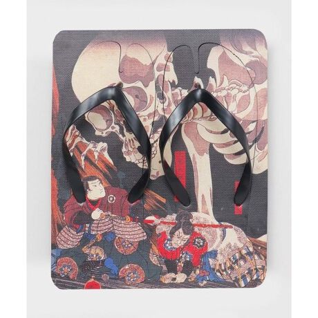 [型番:7LIP5202-2025]浮世絵の柄を大胆に描いた足袋型ビーチサンダル。枠から取り外してビーチサンダルとして履けるのはもちろん、インテリアとしてそのまま飾ることも出来ます。足先が足袋型になっているので、足袋靴下との相性もばっちり。夏の和装や浴衣にぴったりです。フラットに収納出来るので、アウトドアや旅行のお供、お土産としてもおすすめです。