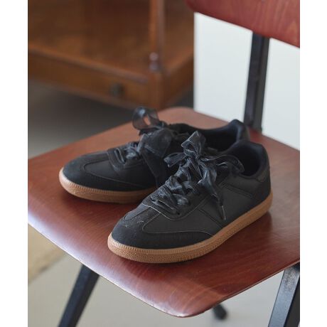 トレンドムードあふれるチュールリボンがポイントのレザー調スニーカー。カジュアルなアイテムながら、マットなレザー調生地が上品な印象です。ヒールタブの煌めくグリッターが華やかなアクセントに。どんなスタイリングにも取り入れやすく、カジュアルスタイルをグッと格上げしてくれるおすすめのひと品です。※モデル着用画像は、光の当たり具合で色味が違って見える場合がございます。※お使いのモニター環境によって商品の色味が違って見える場合がございます。