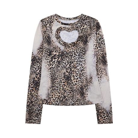 ワイルドなレオパード柄に、胸元のハート型カットアウトが個性を際立たせるロングスリーブトップス。透け感のある素材を使用し、セクシーながらもスタイリッシュな雰囲気に。タイトなシルエットが女性らしさを引き立てる一枚。