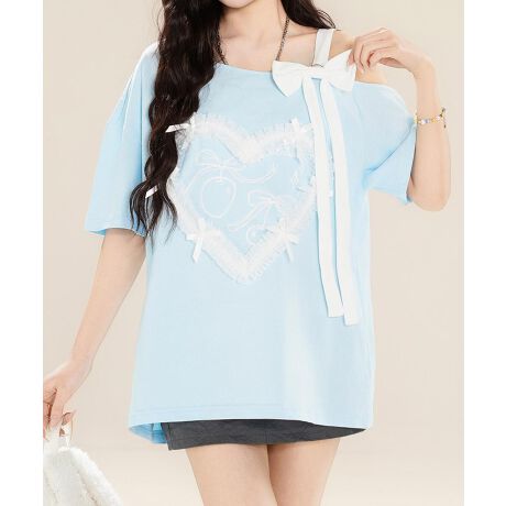 フロントに施されたハートレースとリボンの装飾がフェミニンな印象を与えるデザインTシャツ。肩部分のリボンディテールがアクセントとなり、シンプルながらもガーリーな雰囲気に。程よい丈感とリラックスしたシルエットで、カジュアルながらも可愛らしさをプラス。