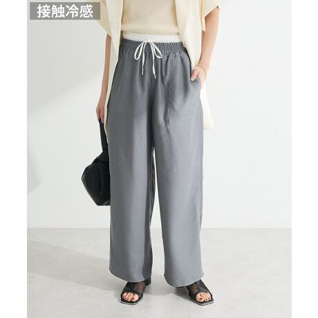 ウエストの配色レイヤードデザインがポイントのツイルイージーパンツ。接触冷感素材を使用し、暑い季節にも快適にご着用いただけます。ややワイドめのすっきりシルエットにウエストゴム仕様で穿き心地も抜群。上品な微光沢感が春夏のシーズンスタイルに映えるおすすめのアイテムです。透け感[ややあり]