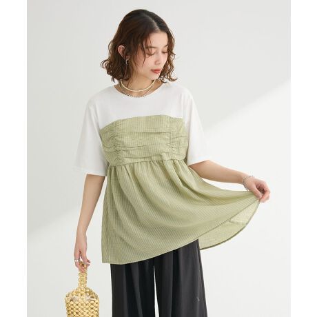 1枚でレイヤード風スタイルが完成するデザインプルオーバー。シンプルな半袖カットソーに表面感のあるビスチェをドッキングしたおしゃれなアイテムです。ウエストラインから程よく広がるフレアシルエットがフェミニンな印象をプラス。ビスチェはバックゴム仕様で着心地もよく、自然に体型カバーも叶えてくれる今季おすすめのアイテムです。透け感[ややあり]