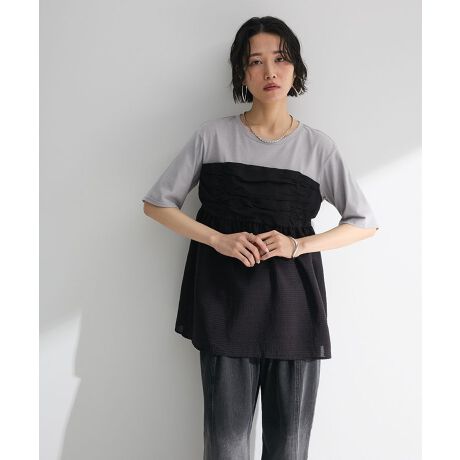 1枚でレイヤード風スタイルが完成するデザインプルオーバー。シンプルな半袖カットソーに表面感のあるビスチェをドッキングしたおしゃれなアイテムです。ウエストラインから程よく広がるフレアシルエットがフェミニンな印象をプラス。ビスチェはバックゴム仕様で着心地もよく、自然に体型カバーも叶えてくれる今季おすすめのアイテムです。透け感[ややあり]