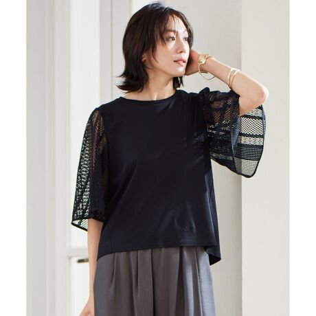 1枚で着映える、上品なレースのフレア袖トップス■デザイン上品な印象の浅めな襟のラインと、レースのフレアスリーブが女性らしいトップスです。シンプルな身頃に、程よいボリュームと今年らしい透け感のある袖が華やかで、二の腕周りもカバーしてくれます。前後差をつけたヘムラインが様々なボトムに合わせやすく、コーディネートに取り入れやすいデザインです。■素材袖部分は、ドイツ製の織り機で自由区オリジナル柄を時間をかけて丁寧に編みました。3種類の素材をミックスしたナチュラル見えの仕上がりです。身頃は、綿の持つ肌触りの良さに加えて、シルケット加工を施し上品な光沢と適度なハリ感がある素材です。■同素材アイテムタンクトップセットトップス(KKWRCM0634)
