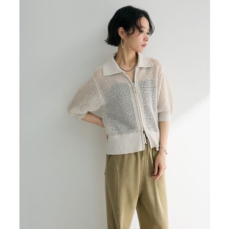 襟付きメッシュ編みZIPカーディガン