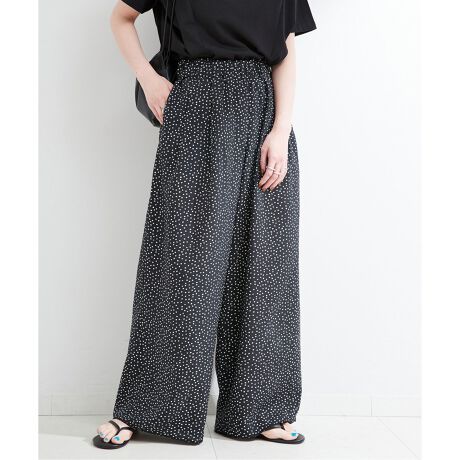 落ち感のあるレーヨンナイロン素材に、小さめなドット柄プリントがナチュラルな印象です。リラックス感のあるウエスト総ゴム仕様で、タックを入れたワイドシルエットが肌離れし、裏地なしですが透けることなく安心して着用いただけます。
