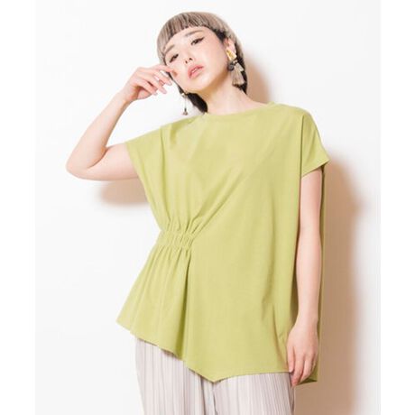 ウエストにギャザーを寄せ、アシンメトリーなシルエットに更にリズムを生み出す。