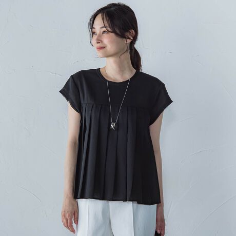 胸元に入ったタックが上品な立体感を演出する、フレンチスリーブブラウス。