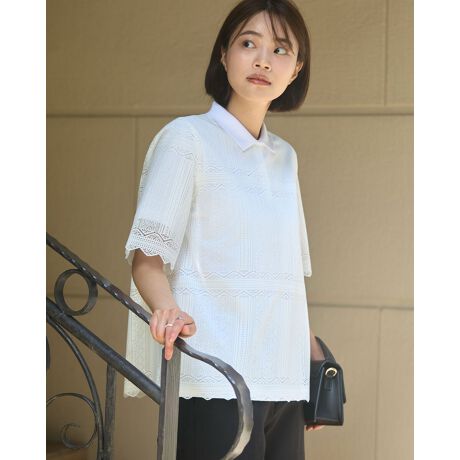 ポリエステル100%のラッセルレースを使用したブラウスです。裏地にキャミソールを付けています。デザインはノーカラーの後ろ釦開き仕様です。袖口と裾はレースの柄に合わせスカラ状にハンドカットしています。色はアイボリーとブラックの2色展開です。本体とキャミソールは取り外し可能です。