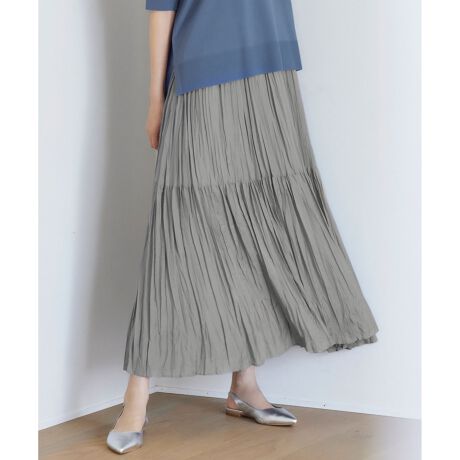 軽やかでイージーケアなプリーツスカート■デザインウエスト総ゴムの1段ティアードのプリーツスカートです。ウエスト部分は細かいプリーツ、裾に向けて少し粗めのプリーツ加工を施すことで、よりフェミニンなシルエットになるように仕上げています。透けるような軽い素材とハンドワッシャーのプリーツ加工素材なので、アイロン要らずで取り扱いが簡単な点もポイントです。くるくる丸めて保管したり、旅行へ持っていく時にも丸めて持ち運べるのも便利です。清涼感と軽さが特徴のサップ裏地を使用しているため、暑い夏にも快適に着て頂けます。■素材経糸にブライト糸、緯糸にスパン糸を使用しております。適度な透け感、ブライト糸の微光沢感、スパン糸の天然ライクな肌触りが特徴の、軽やかで接触冷感機能付きの素材です。裾に向かって緩やかに広がるハンドワッシャープリーツ加工を施しました。■同素材アイテムストライプ柄スカート(SKW7GM0511)