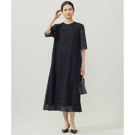 リーフモチーフの総レースが華やかなワンピース■デザイン裾にかけて上品に広がるナローシルエットの総レースワンピースです。切り替えに無地の挟み出しテープを使用しております。袖は肘が隠れる丈感で、スカラップカットが華やかな印象。後ろのグログラン付きファスナーは、ファスナーの開閉がしやすくディテールのポイントにもなります。無地のサッシュベルトをウエストマークした上品な着こなしもおすすめです。■素材立体感のあるリーフモチーフのコードレースが上品で華やかな印象です。メッシュ部分にポリエステルを使用することで、適度なハリ感と光沢感を表現しています。