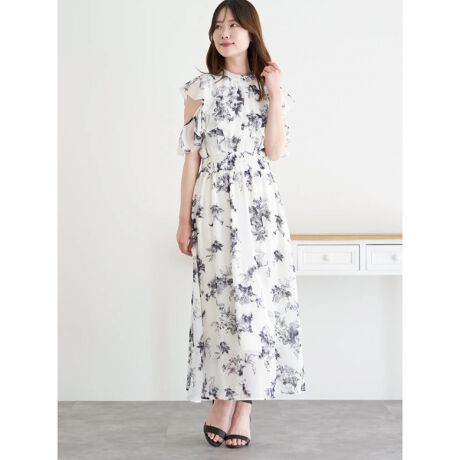 花柄プリントオープンショルダーフリルワンピース