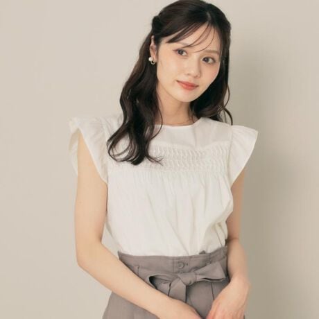 細幅のタックで繊細な表情にし、タック下からギャザーを入れており、可愛らしいブラウスになっています