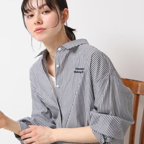 【洗える】ロゴ刺繍入りストライプオーバーシャツ